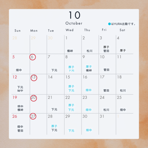 以上を10月の各スタッフのお休みとさせて頂きます。
